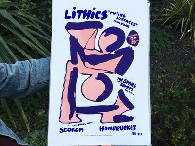 12" x 16" silk-screened poster by Josh Kermiet and Jon Grothman for Lithics' album release show at The Spare Room on May 26th.