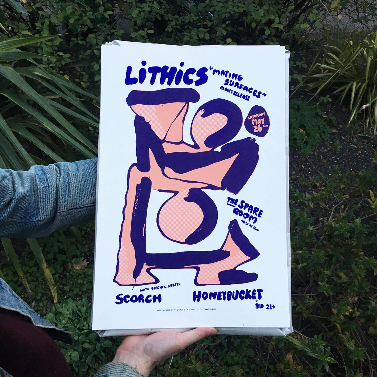 12" x 16" silk-screened poster by Josh Kermiet and Jon Grothman for Lithics' album release show at The Spare Room on May 26th.